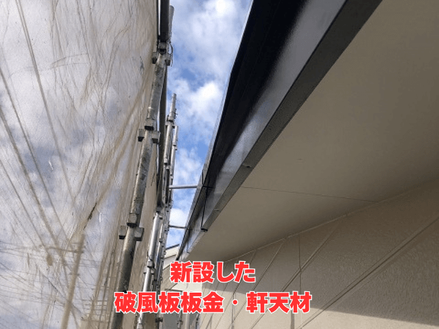 さらに、破風板とケラバについては、新しい木材の上から「板金(ばんきん)」を被せて保護する仕上げを行いました。板金で覆うことで、木材が直接雨風にさらされるのを防ぎ、塗装に比べてメンテナンスの周期を大幅に延ばすことができます。