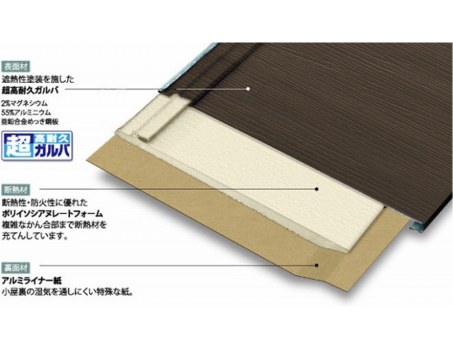 まず、スーパーガルテクトは「ガルバリウム鋼板」というサビに強い金属板をベースに、さらに耐久性を高めた超高耐久ガルバを使用しています。非常に軽量なため、建物への負担が少なく、地震の揺れにも強いのが特徴です。また、裏面に断熱材がふんだんに充填されているため、夏は涼しく冬は暖かい、快適な住環境を実現します。