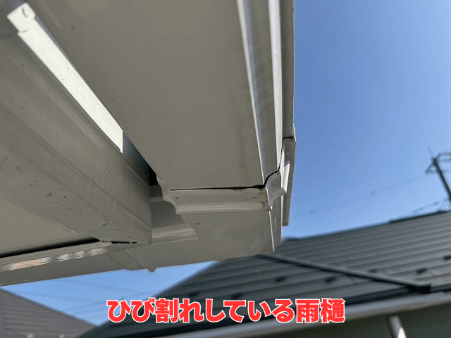 さらに調査を進めると、もともと雨樋は季節の温度変化で伸び縮みするように遊び(余裕部分)を持たせて設置するのが重要ですが、今回の雨樋は端から端までボンドで固定されていて、その結果、本来の伸縮ができず引っ張られてしまい、継ぎ目に隙間が生じていたこともわかりました。