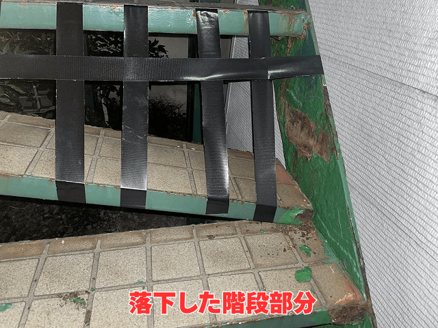 今回お伺いしたのは、二階建てアパートの外階段が破損してしまったというご相談です。外階段とは建物外側に設置されている階段で、日々の利用や雨風に晒されることで劣化が進むことがあります。現地では階段部分に錆(さび)や腐朽(腐食してボロボロになること)が進行している状態が確認できました。触れると層状に崩れるほど劣化しており、そのまま放置すると落下や事故につながる危険性が高い状態でした。