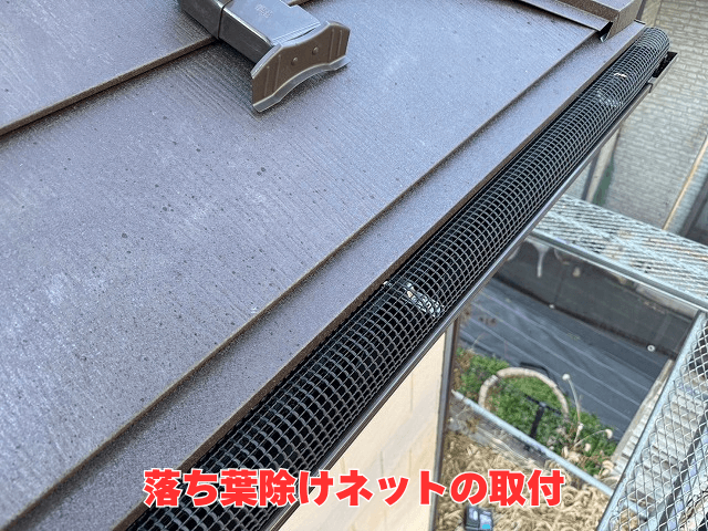 工事では、雨樋に適切な勾配(こうばい:一定方向へ水が流れる傾き)を付けながらネットを取り付けていきました。雨樋に勾配が無いと水が停滞してしまうため、勾配を正しく取ることは水の排水効率を高めるうえで非常に大切です。