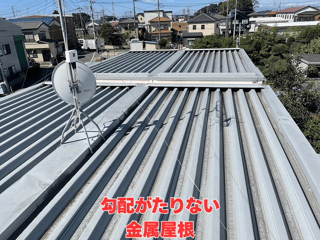 まずは現地調査を行い、雨漏りが発生している原因を確認しました。調査の結果、既存の屋根に十分な勾配(雨水が自然に流れる傾き)がなく、雨水が停滞しやすい状態であることがわかりました。屋根に勾配がないと、雨が降った際に水がスムーズに流れず、雨漏りのリスクが高まります。