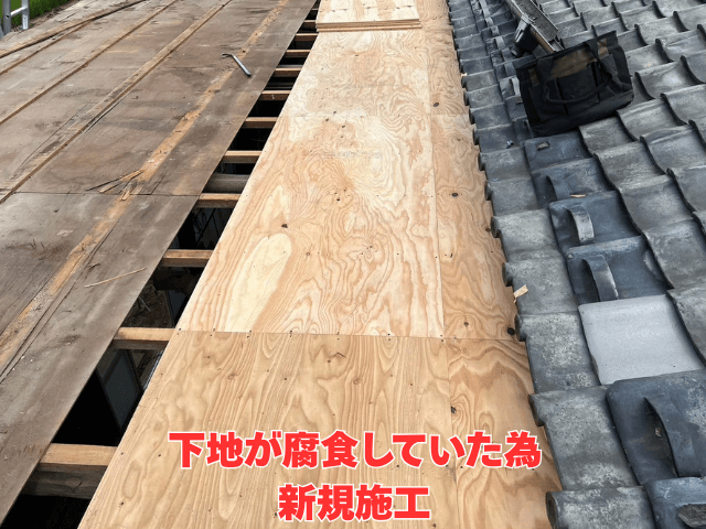 撤去後は 下地工事 を行います。腐食していない垂木(たるき:屋根の骨組み)を確認しつつ、新しい合板(コンパネ)を丁寧に貼っていきました。コンパネは屋根材を支える重要な下地材で、釘を一定間隔で確実に固定することで強度を高めています。