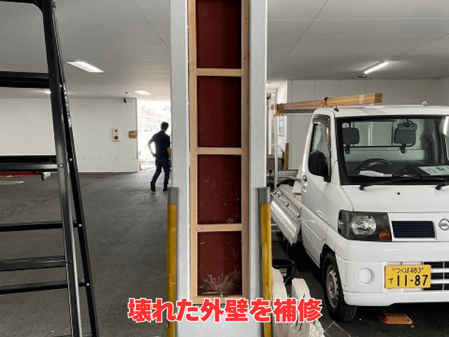今回のご依頼は、商業施設の外壁の一部が車との接触事故で壊れてしまったため、その損傷部だけを修繕したいという内容でした。外壁は建物を雨風から守る大切な部分であり、壊れたままにしておくと雨漏りや断熱性の低下など、建物内部への悪影響が出やすくなります。そこで部分的な張替え工事を行い、見た目も性能も元に戻す対応をしました。