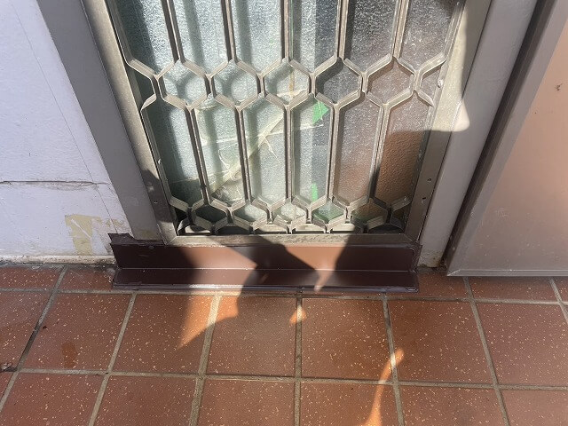 さらに、玄関まわりの部分補修工事も実施しました。長年の雨風による腐食で玄関周辺に穴が開き、雨水や湿気の侵入リスクがある状態でしたので、板金で穴を塞ぐ補修を行い、見た目も機能も改善しました。板金は金属でできた薄い板のことを指し、雨水を遮断する役目があるため、こうした補修に最適な材料です。