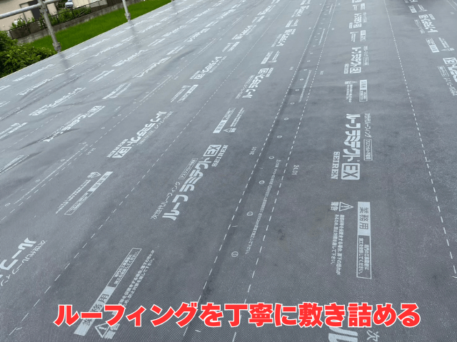 工事は劣化したルーフィングを撤去し、新しい防水シートへと交換していきます。新しいルーフィングは屋根材と密着させることで、雨水が裏側に回り込むのを防ぎ、家全体の防水性能を高めます。