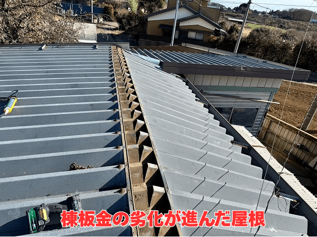 調査の結果、屋根の頂上部分に取り付けられている「棟板金(むねばんきん)」と呼ばれる金属のかぶせ材が劣化しており、ここから雨が侵入している可能性が高いと判断しました。