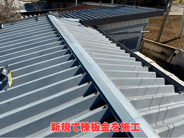 この工事は、新しい金属板を使って棟部分の防水性を回復させるもので、雨漏りの原因を根本から解消する効果があります。