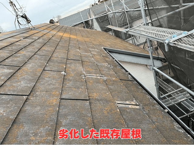 長年の風雨にさらされた屋根は色褪せや傷みが進行しており、特に屋根の頂点にある金属部分(棟板金)が劣化している状態でした。
