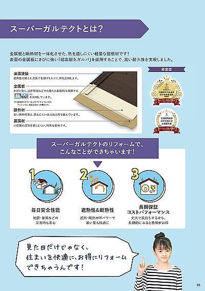 「カバー工法」で使用されるスーパーガルテクトは、金属製の屋根材に断熱材を一体化したもので、耐久性・断熱性・遮熱性に優れている点が大きなメリットです。