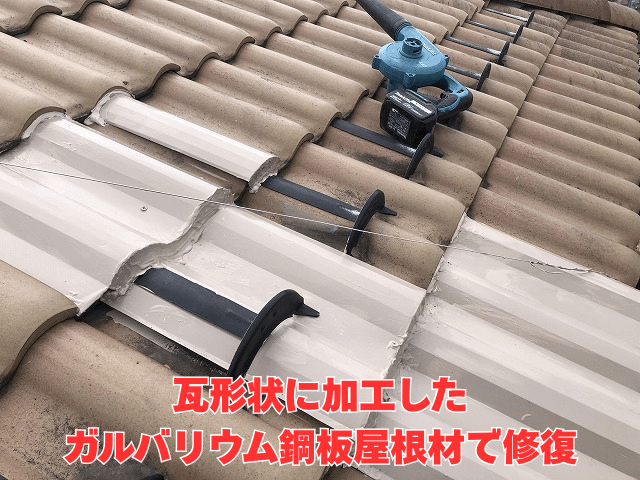そこで、当社ではガルバリウム鋼板という金属屋根材を使って瓦の形状を再現する工事を提案しました。