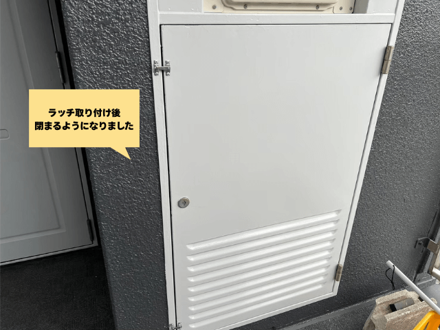まずは 現地調査 を行います。アパート設備では、ガスメーターや水道メーターを守る扉部分が、ラッチ金具(扉を固定する部品)の不具合で風などの影響で開いてしまっていました。