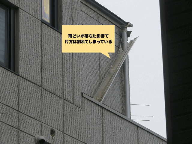 遠目から見ても雨どいが傾き、本来の役割を果たせていない状態でした。